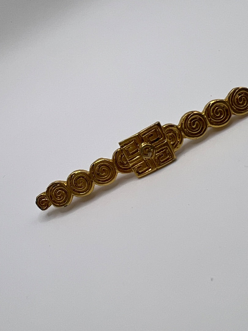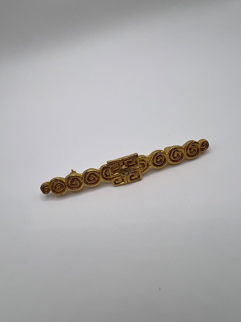 Vintage gold toned metal bar brooch with Etruscan revival style design featuring spirals and a central square motif