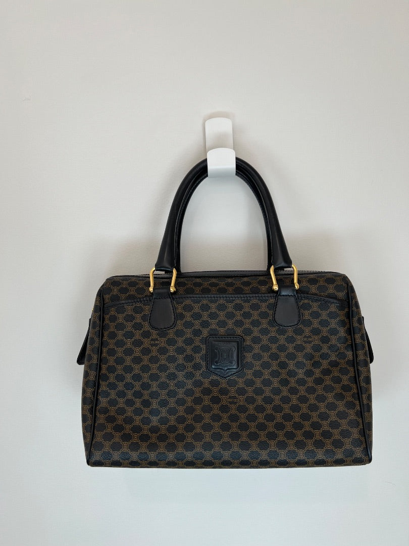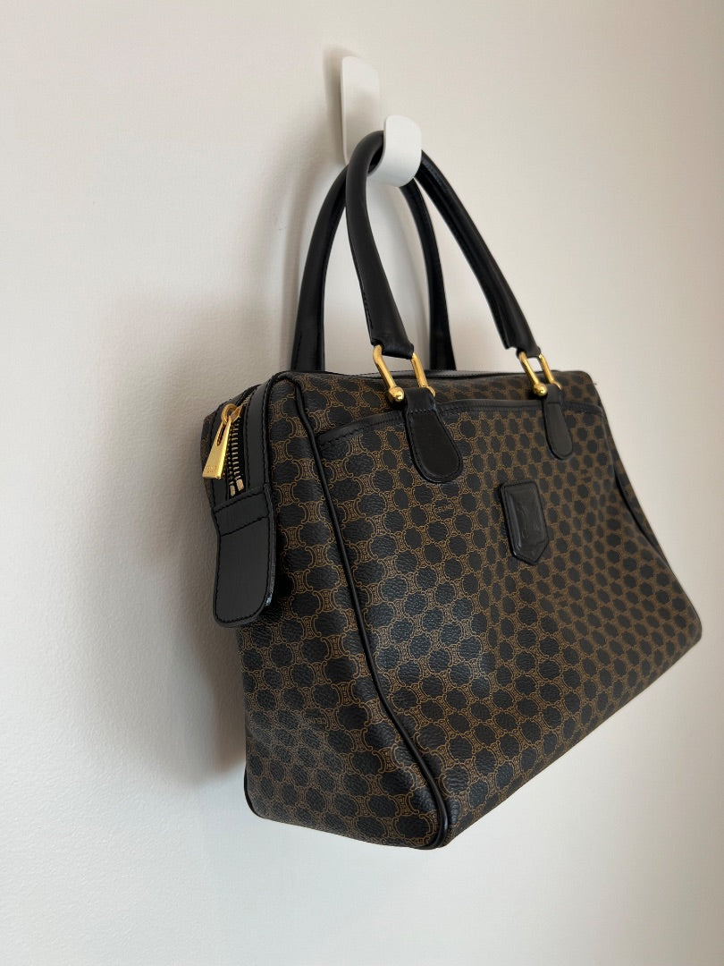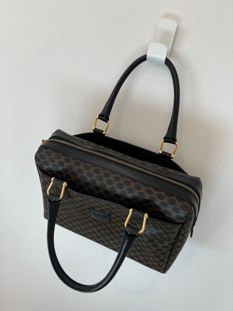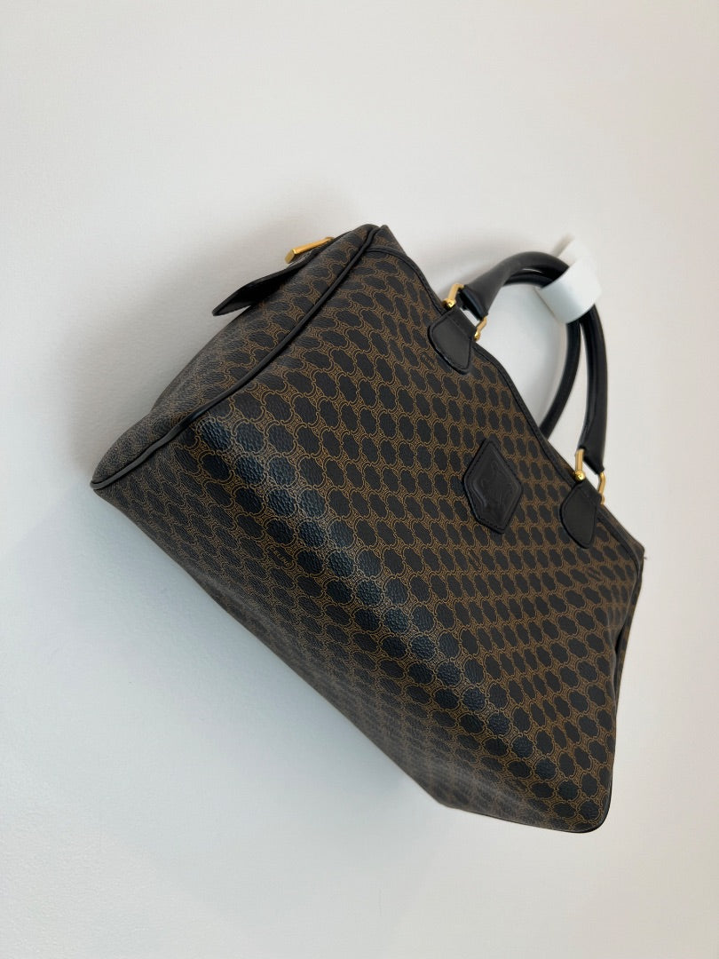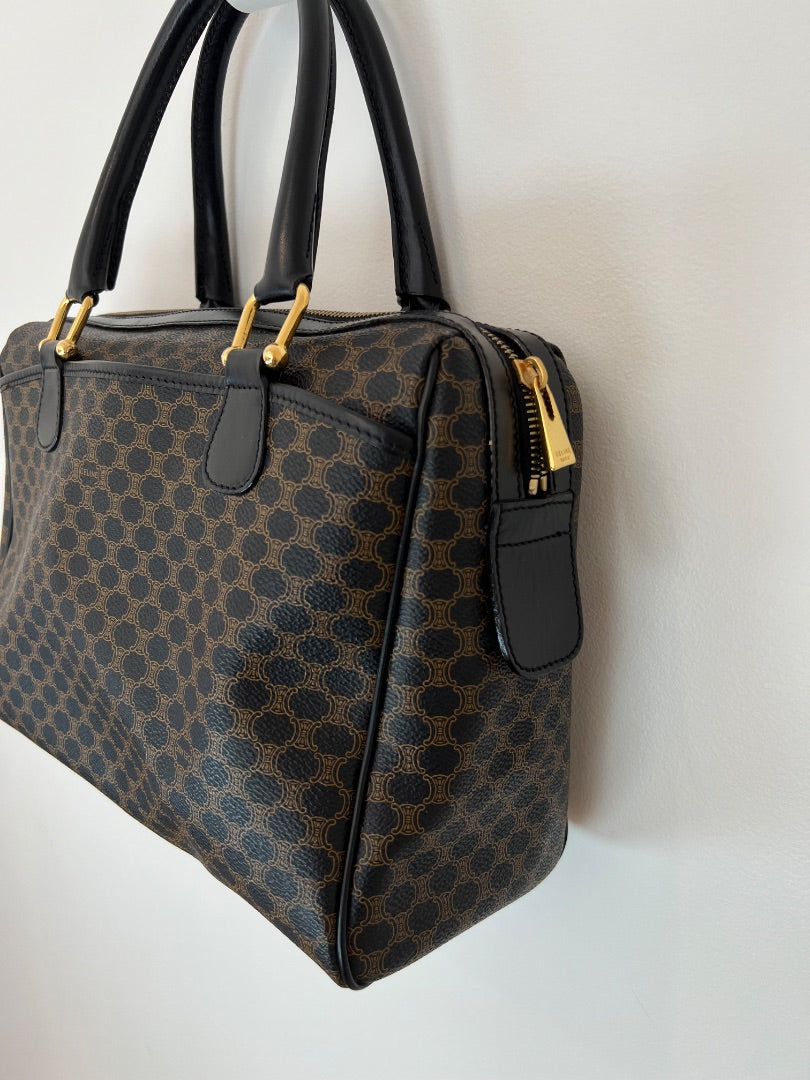 Celine vintage Macadam Boston bag in brown coated canvas with leather trim and gold toned hardware