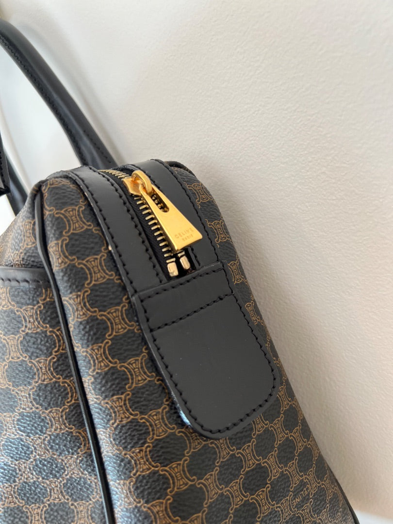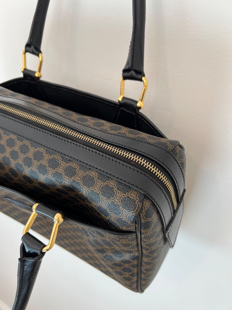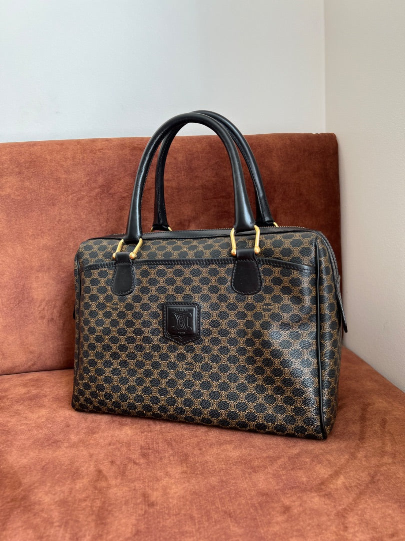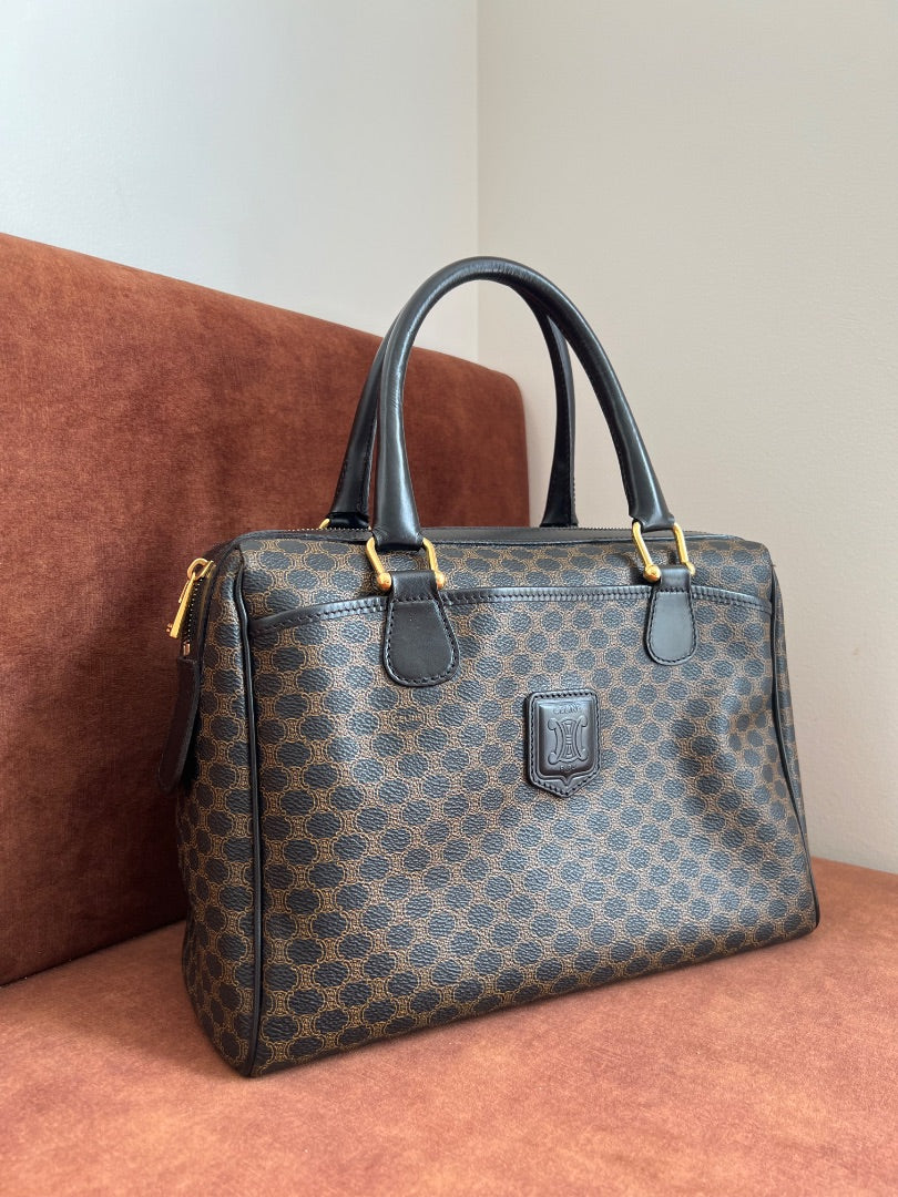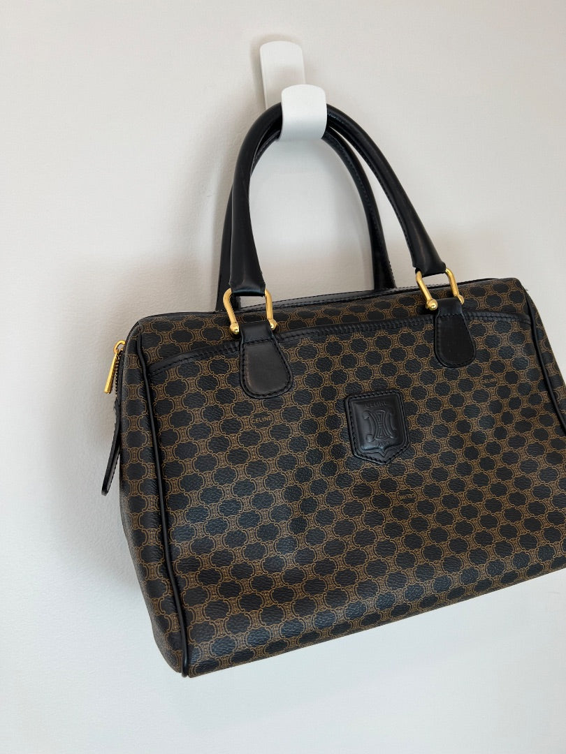 Celine vintage Macadam Boston bag in brown coated canvas with leather trim and gold toned hardware