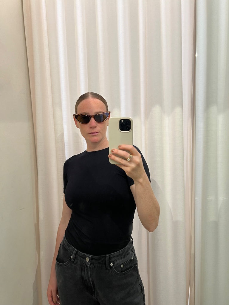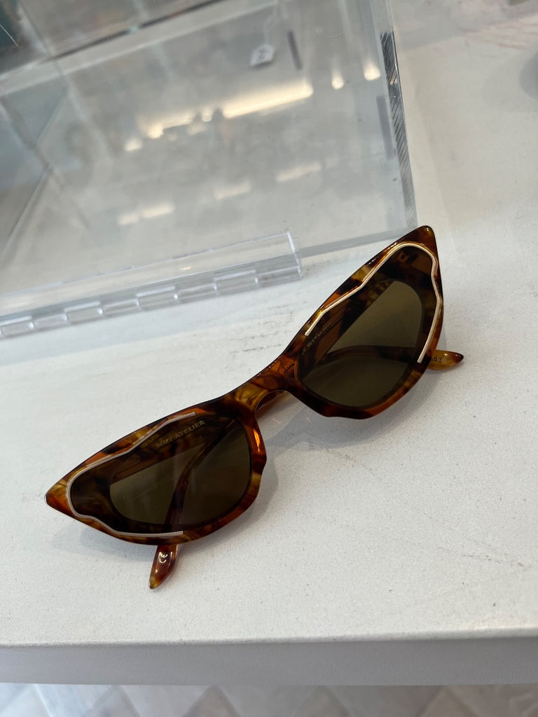 Moy Atelier "come fly with me" skinny cateye sunglasses with gold metal thread around the lense rim